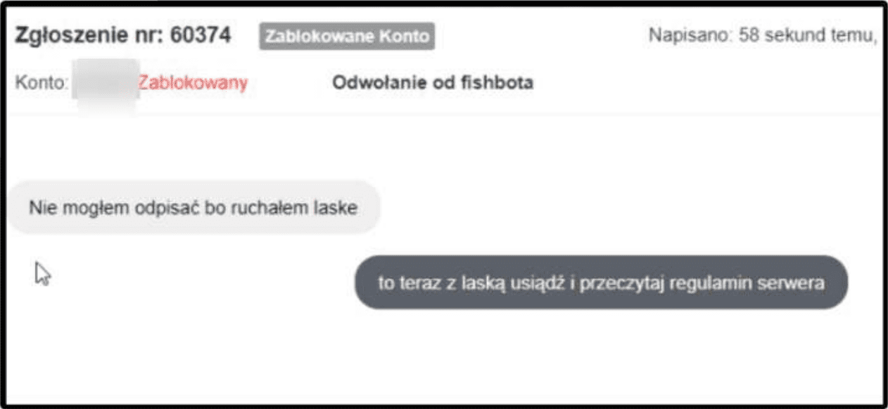 Jedno ze zgłoszeń szczególnie zapadło PinkLady w pamięć. Chodzi o chłopaka, który spamował na czacie „GM kurwo jebana zwiększ drop z małży”. Najpierw dostał bana na tydzień. Potem, gdy zorientował się, że blokada faktycznie weszła, napisał jeszcze obszerne odwołanie o treści „chuj wam w dupy cwele”,I tu niespodzianka! Skończyło się permanentnym banem. Najlepsze przyszło jednak później, bo następnego dnia zapytał już spokojniej: „Kiedy moja blokada się skończy? Miałem zły dzień”. I chyba trudno o lepszy przykład tego, jak szybko potrafi zmieniać się ton niektórych graczy, gdy ręce się czensą, a serwerek jest niedostępny.